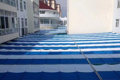 幼儿园户外遮阳帘高密度聚乙烯(HDPE) 材质,防晒遮光率90%+,抗紫外线、防水防霉,透气不闷热,孩子活动不闷汗。